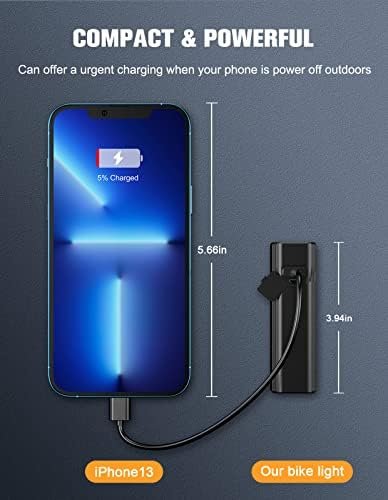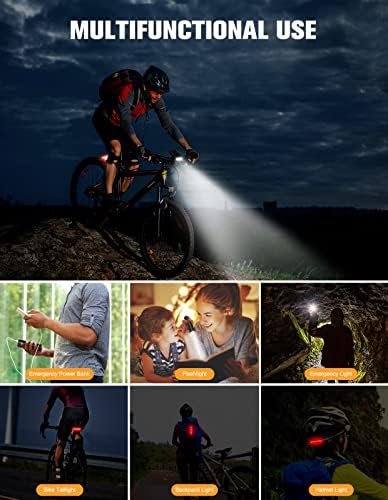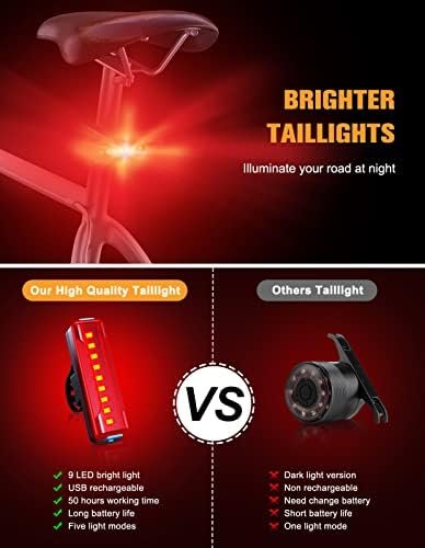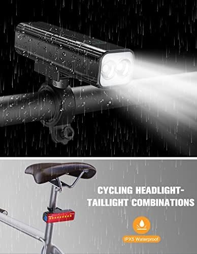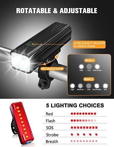 【Multiple Lighting Modes】:The bicycle headlight can switch between 3 modes and 5 modes by long press button 3s. (Mode 1: High – Low – Strobe; Mode 2: High – Medium – Low – Strobe – SOS). Taillight has 5 lighting modes (constant, flash, SOS, strobe, breath). This bicycle lights set is essential for riding.