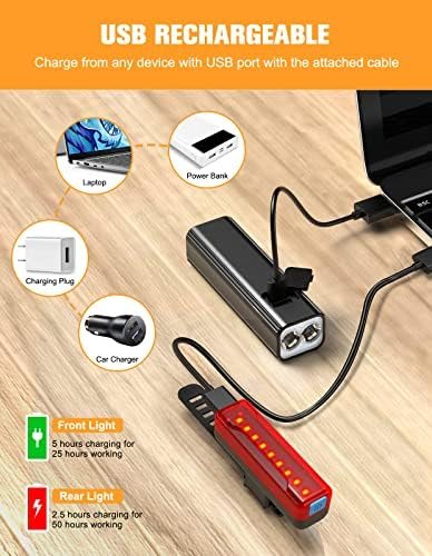 【USB Rechargeable Cycling Light】: Built-in rechargeable Lithium battery, the bicycle light save your trouble in buying battery. The front light offers 6 hours running time in high lightness or 18 hours in low lightness after 5 hours charging via micro-USB cable(included); The rear red light can use 50 hours in high lightness mode after only 2.5 hours charging via micro-USB cable.