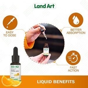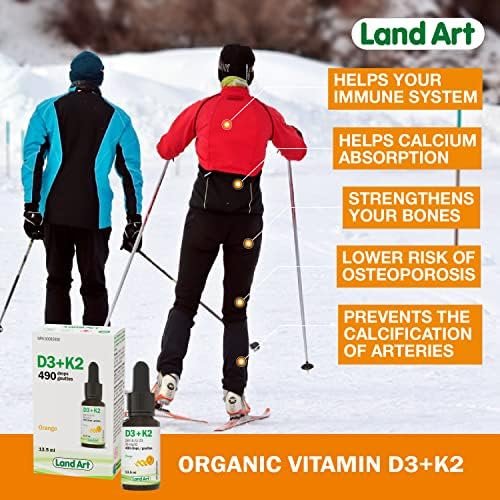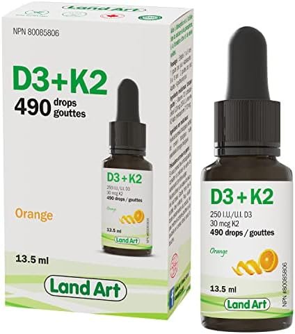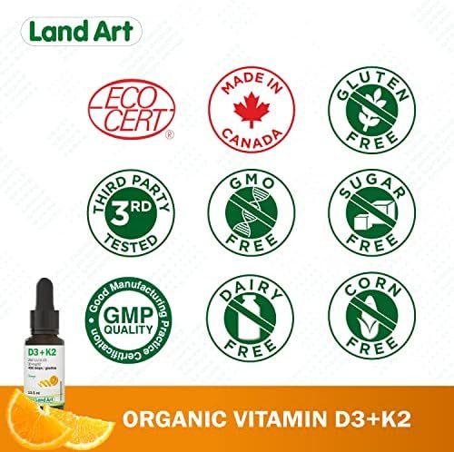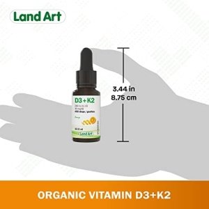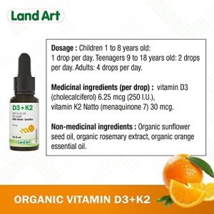Land Art’s Certified Organic Vitamin D3+K2 is gluten free, vegetarian and preservative free! Our Vitamin D3+K2 drops are made with naturally sourced D3 vitamin derived from lanolin and natural vitamin K2-MK7 sourced from Natto. The D3+K2 vitamin is mixed with organic sunflower seed oil. Our D3+K2 vitamin product comes with a dropper to facilitate dosage. One drop contains 250 IU of vitamin D3 and 30 mcg of vitamin K2-MK7. Each bottle contains 490 drops.