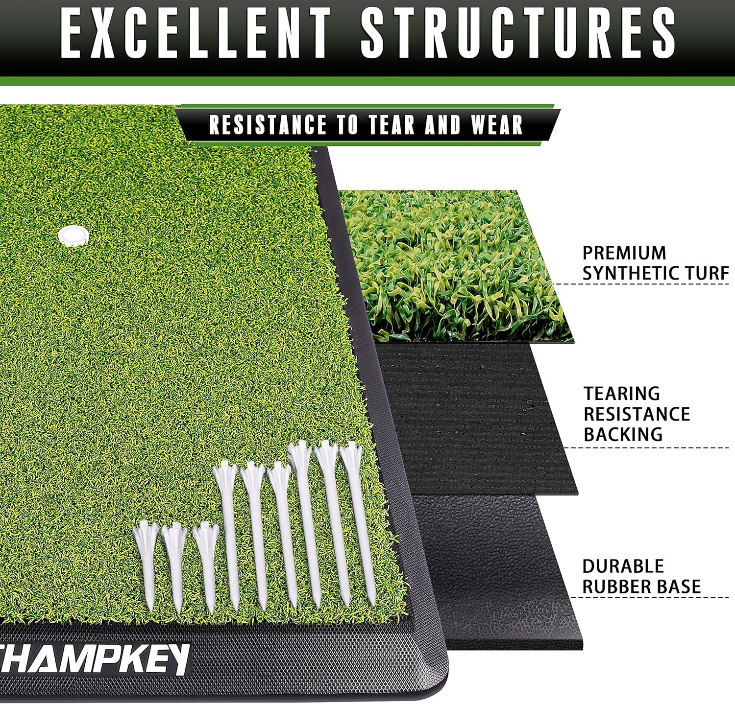 Premium Synthetic Turf : 16 mm true-turf surface simulates hitting from a real fairway or tee box.