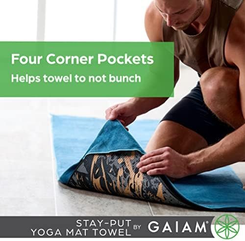 The Gaiam Stay-Put Yoga Towel is a hypoallergenic microfiber that absorbs twice as much as standard cotton, and dries in half the time. Features four corner pockets on the backside which holds onto the mat and secure the towel in place and prevents bunching. Fits over a standard size yoga mat (68″L x 24″W).