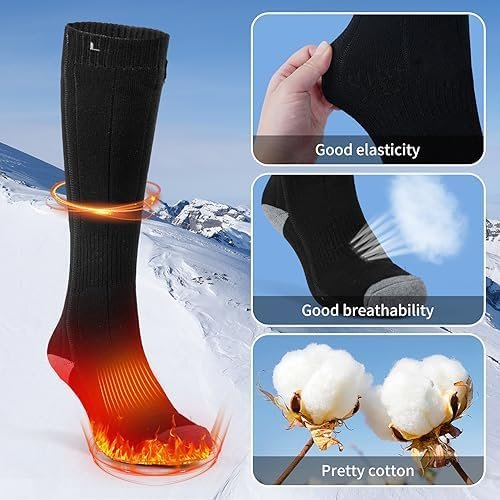 Soft and Breathable Material for Electric Heated Socks – These heated socks are very soft and stretchy, comfortable to wear, warm and breathable, and made of 80% cotton, 17% elastane, and 3% spandex, Elastane is a stretchy material that can hold your feet and legs tightly to prevent slipping. Heated socks use high-quality carbon fiber wire heating elements to help people with Raynaud’s syndrome or chronic circulatory problems improve blood circulation and reduce soreness.