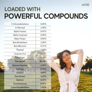 Powerful Source of Antioxidants – Herba’s Oregano Oil contains 18 different aromatic compounds including carvacrol (81.59%), thymol (1.03%), para cymen and terpene. These beneficial compounds work together to provide antioxidants!