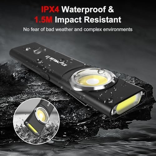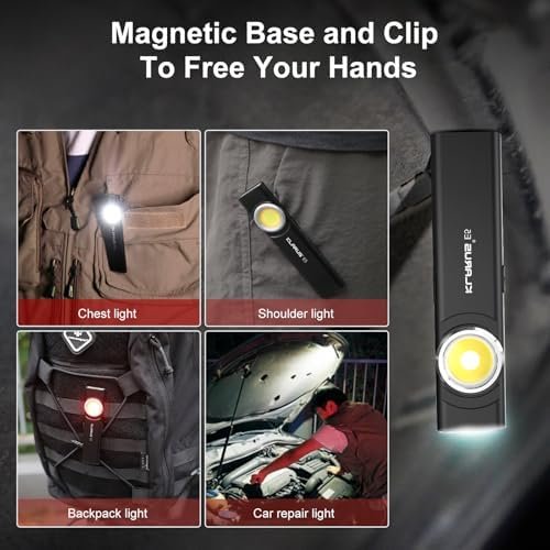 【Clip and Magnetic Design】Our work light adopts magnetic base design, which can be firmly attached to various metal surfaces; the clip of the flashlight can also be fixed on belts, hats, tents and other attachments, freeing your hands while stabilizing the use of the flashlight.