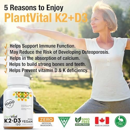 HELPS IN THE ABSORPTION OF CALCIUM WITH Plantvital vitamin D with K2 COMBO: Our high-potency natural D3 supplement helps the body absorb calcium, while K2 ensures it ends up in your bones.