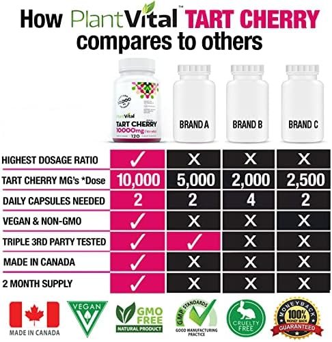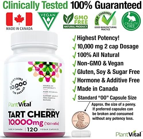 THE POWER OF POTENCY: Our vegan Tart Cherry product is equivalent to 10,000mg (10:1 ratio) per 2 capsule dosage – one of the highest on the market. Real strength – great value! Also vegan, non-GMO, additive free and made here in Canada.