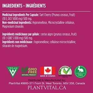 QUALITY OF MANUFACTURING IS EVERYTHING: Many Tart Cherry supplements are made overseas with dubious hygiene and questionable quality standards. Plantvital Tart Cherry capsules are made right here in Canada in our GMP approved plant.