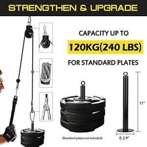 【Premium Material】This pulley attachments for gym is made of heavy-duty steel with 360°rotate to ensure stable and quiet; Pulley cable is made of high-strength PU material and steel wire, it can withstand strong friction; Loading pin can fit standard weight plates, max weight loads up to 220LBS, meeting various training.