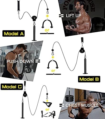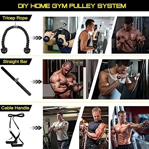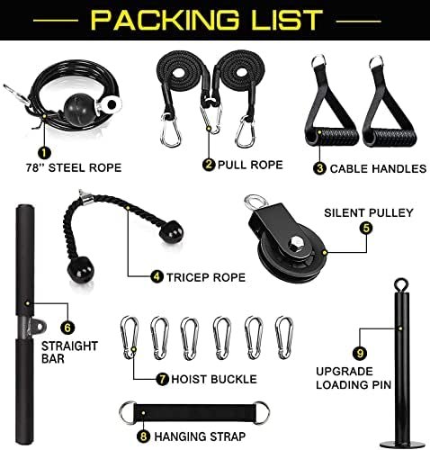【Home Gym Equipment Includes】This fitness pulley attachments package includes: 1 silent pulley, 1 steel cable, 1 loading pin, 1 tricep rope, 1 lat pull bar, 1 cable handle with line, 6 buckle, 1 hanging strap. If you have any questions for our pulley system, Please contact us through the Amazon store.