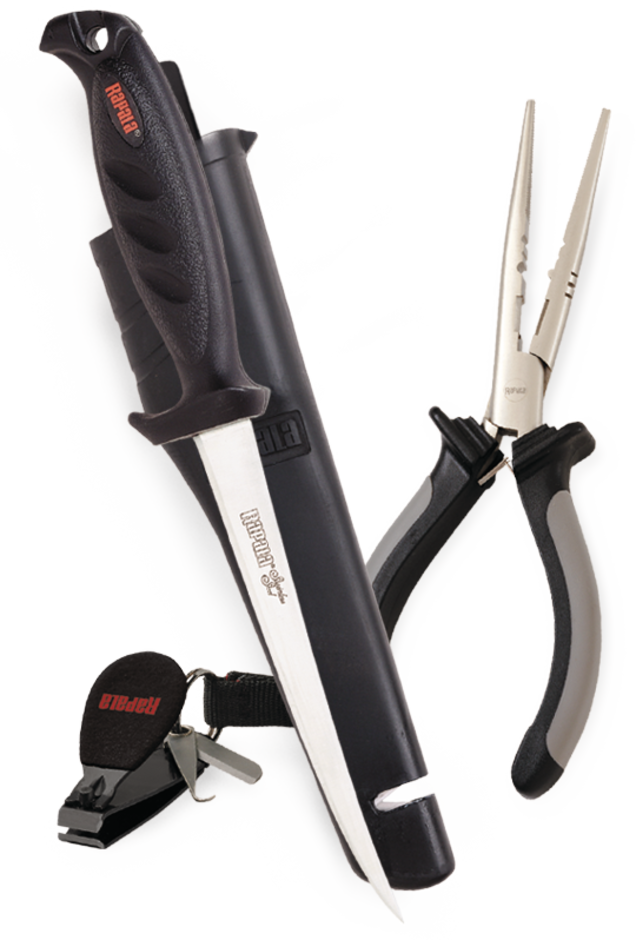 6-1/2″ Fisherman’s Pliers, Falcon Fillet Knife/Sheath and Rapala Fishing Clipper.