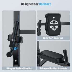 【Designed for Comfort】The 10 degree reclined position, padded armrests and backrest add an extra level of comfort during exercises like dips, making the workout experience more enjoyable and less strenuous on your joints.