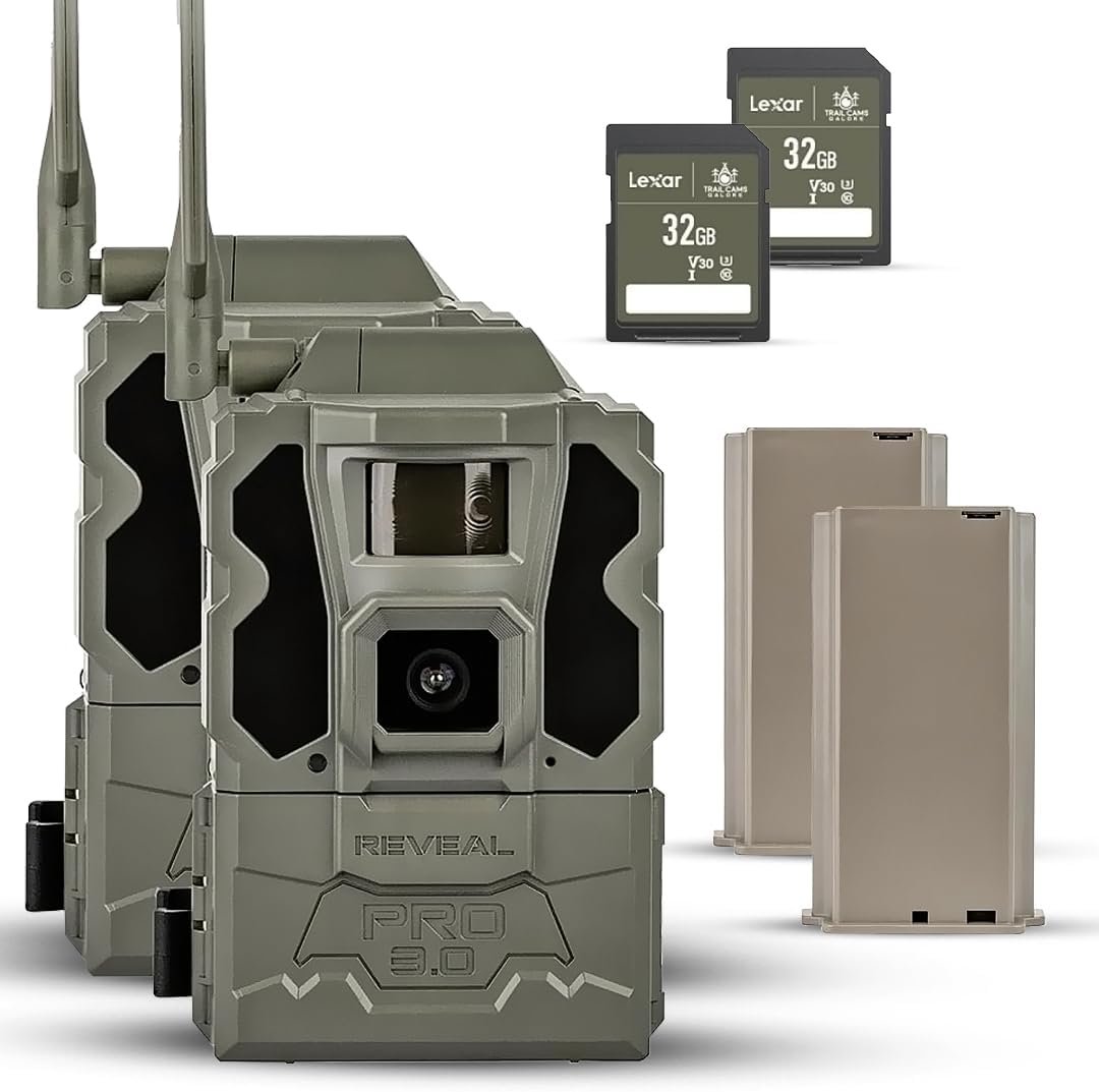 Includes Two Tactacam Reveal Pro 3.0 Trail Cameras, Two Tactacam Reveal Lipo Lithium Battery Packs, and Two Lexar 32GB SD Cards by Trail Cams Galore, a Trademarked Brand. The Tactacam Reveal Pro 3.0 is highly adaptable. It can be paired with optional accessories such as solar panels for extended battery life, and it is designed to work on multiple cellular networks, giving you flexibility in choosing your cellular provider.