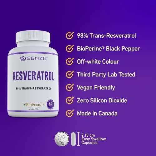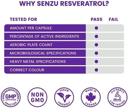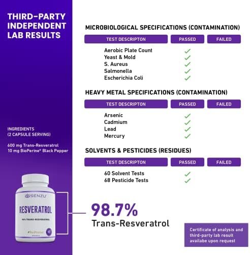 PREMIUM QUALITY: Senzu high purity Trans Resveratrol is off-white and not brown. To ensure that you are getting the highest-quality product, each batch is tested for quality and purity both during and after manufacturing. 98% Trans-Resveratrol raw material imported from Sweden. Source of antioxidants.