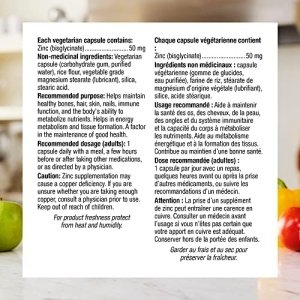 Each Capsule Contains: 50 mg of elemental zinc to help support immune function and wound healing, and promote healthy connective tissue, skin, hair, and nails