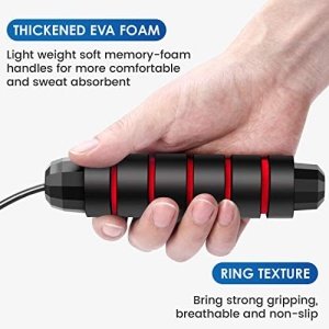 【ERGONOMICALLY COMFORTABLE JUMP ROPE HANDLES】- Ergonomically designed handles, coated with 6 inch soft PVC memory foam that is breathable, comfortable and non-slip to make the jumping rope easy to hold and carry, allowing you to exercise easier and longer.
